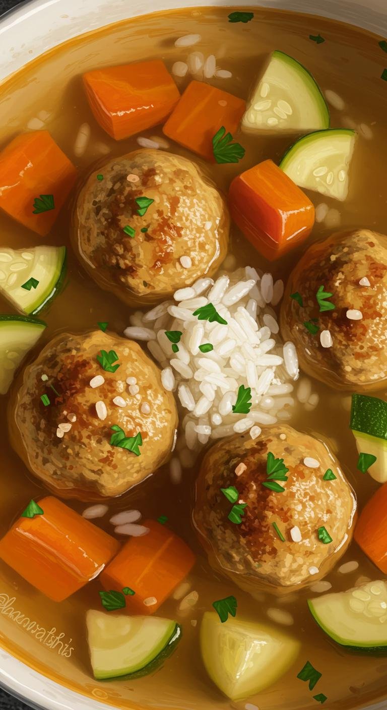 - Follow the classic steps for the broth and veggies; add meatballs to simmer and cook.
