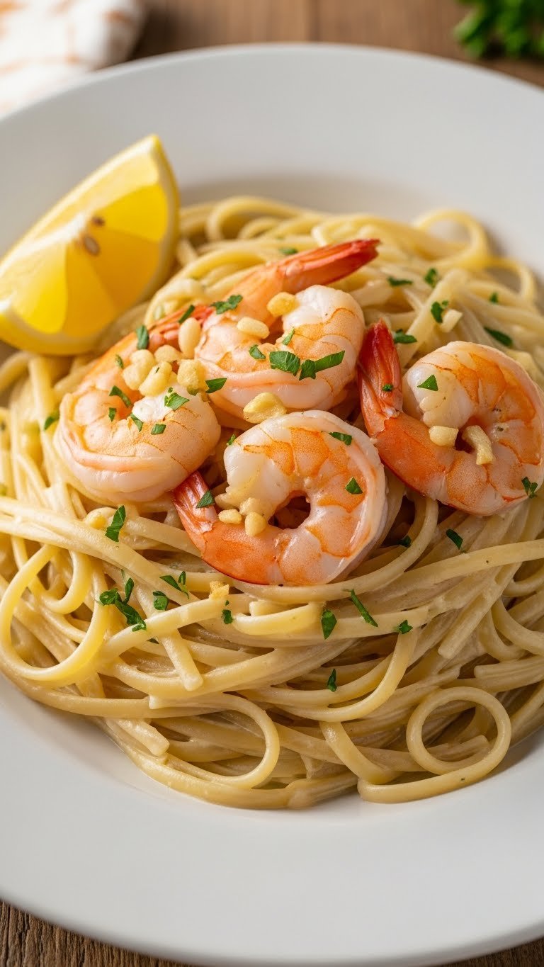 - Sauté garlic in a pan, add shrimp, and cook until pink.