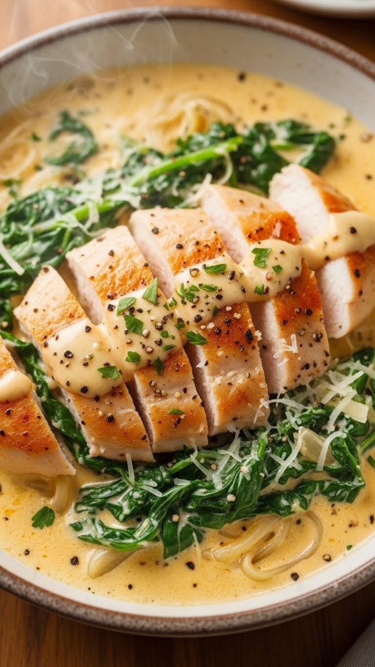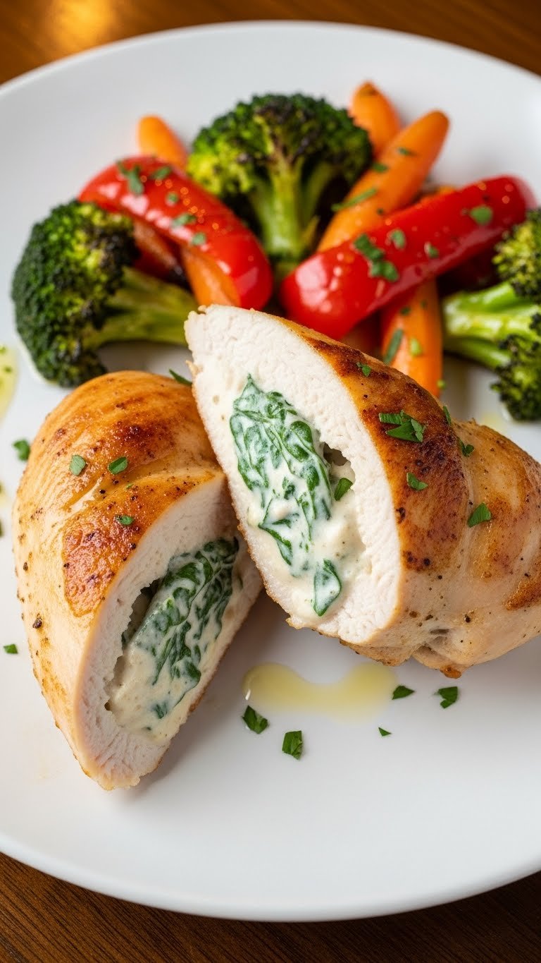 - Cut a pocket in each chicken breast and stuff with spinach and Alfredo.