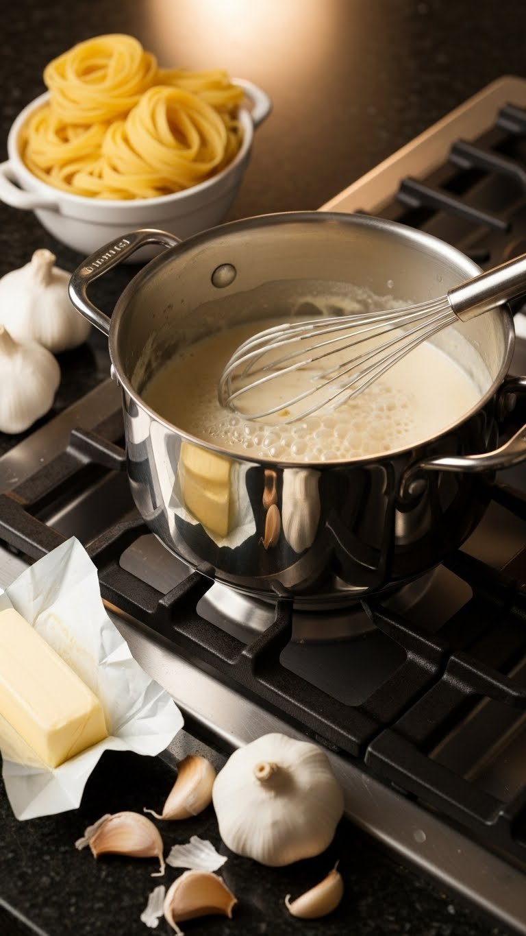 - Melt butter in a saucepan, then slowly whisk in heavy cream until warmed.