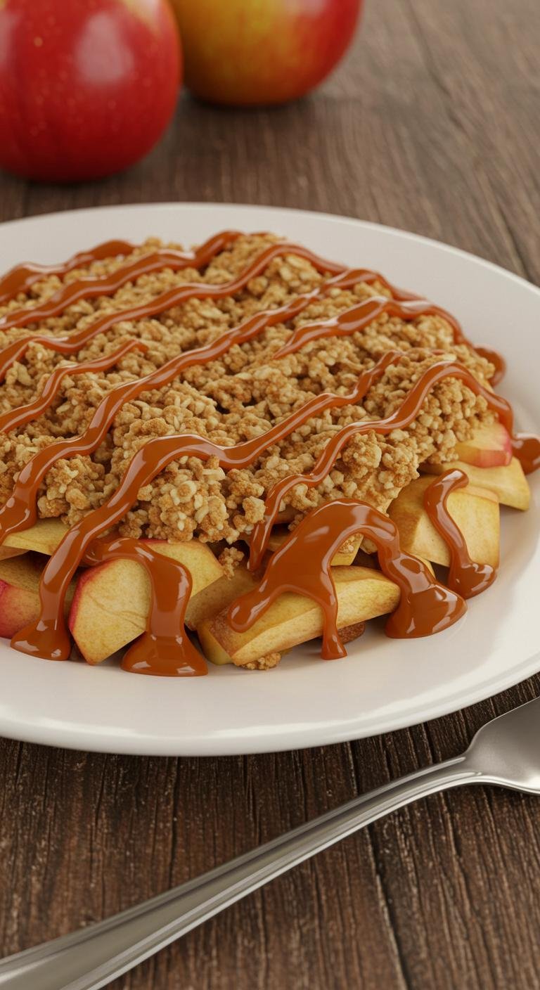 - Mix oats, sugar, flour, and melted butter; top the apples generously.