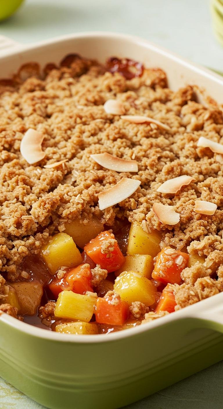 - Combine oats, sugar, coconut, and melted butter; sprinkle on fruit.