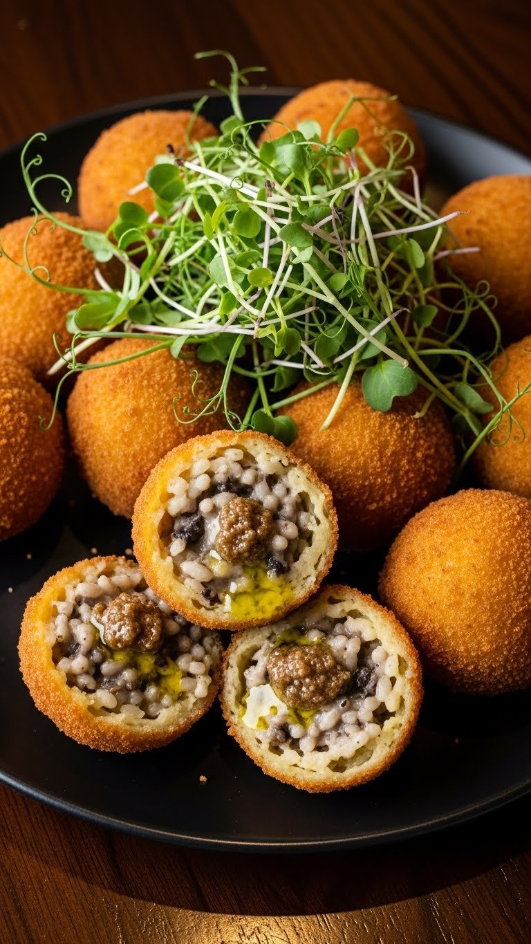 - Combine mushrooms and truffle oil with risotto; form into balls.