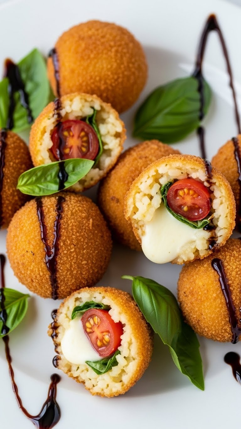 - Mix tomatoes and mozzarella into risotto; form into balls.
