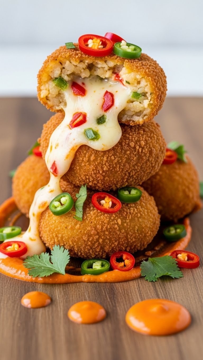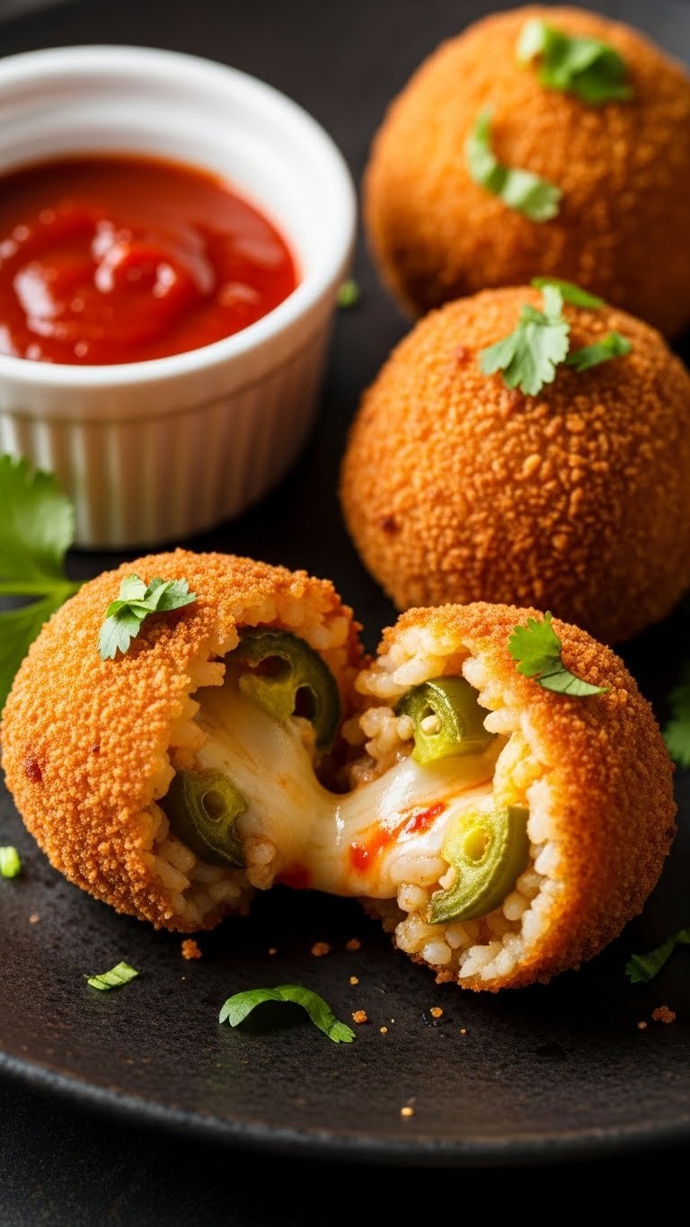 - Mix cheddar and jalapeño into the risotto; form into balls.