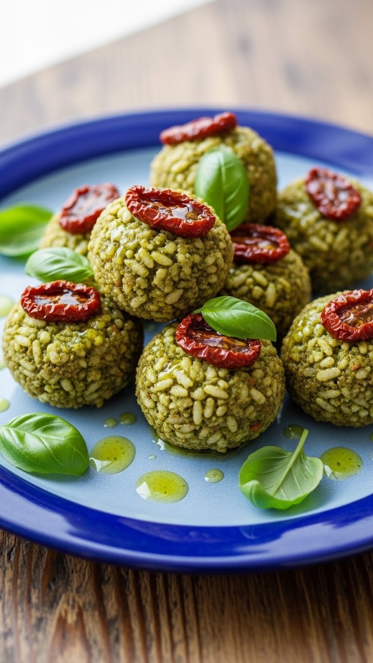 - Mix pesto and sun-dried tomatoes with risotto; form into balls.