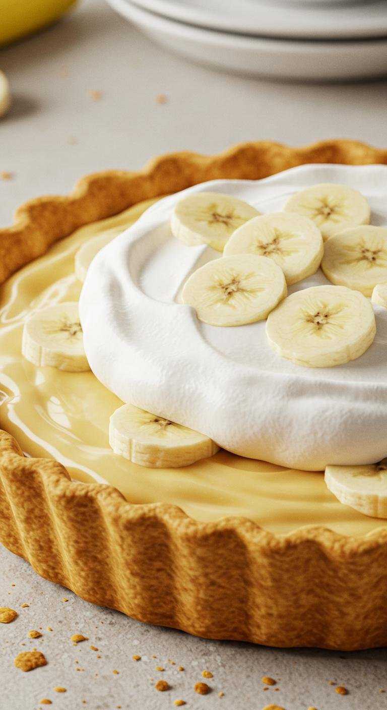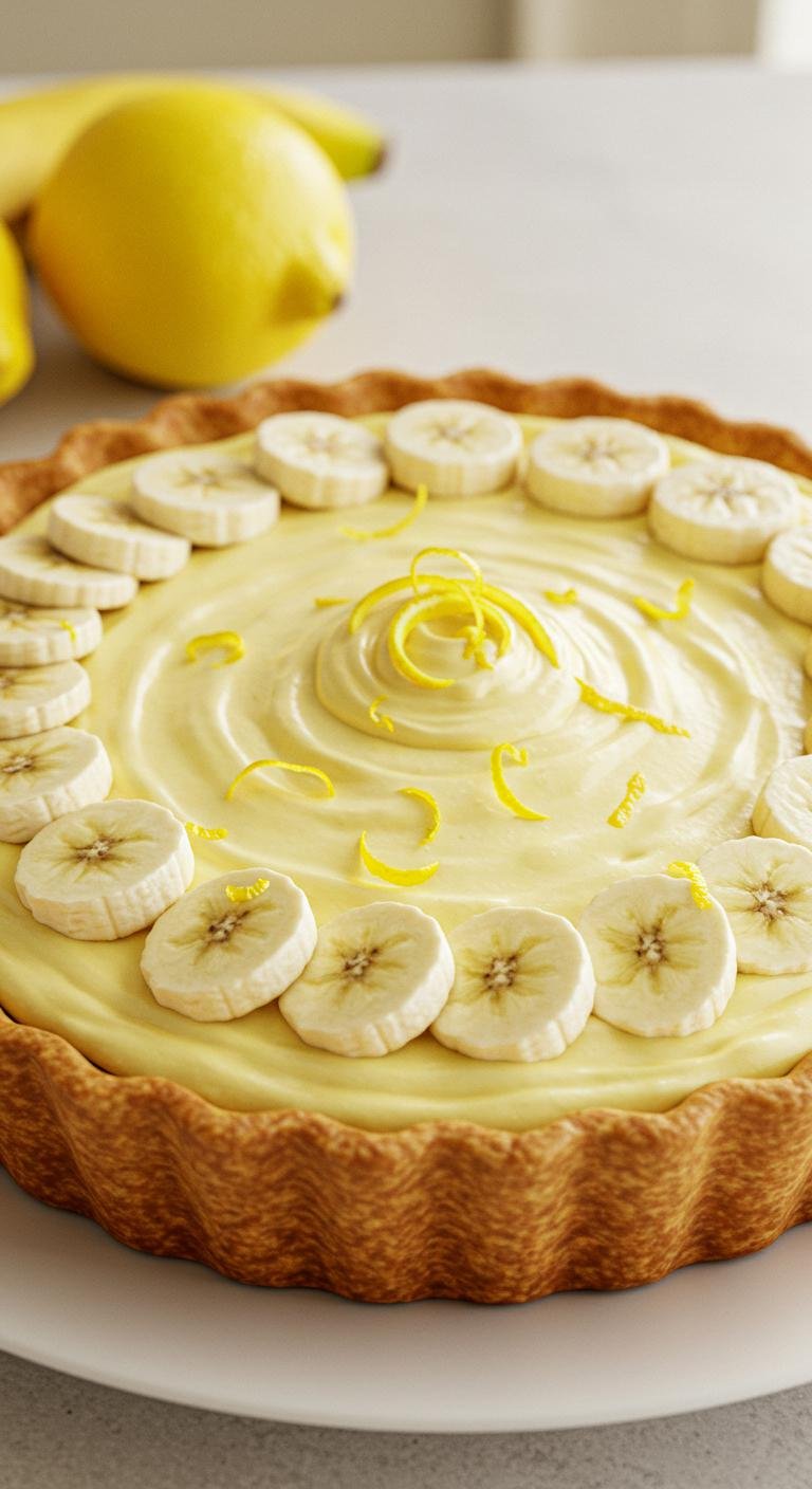 - Add sliced bananas into the crust, pour the lemon mixture over, and chill until set.