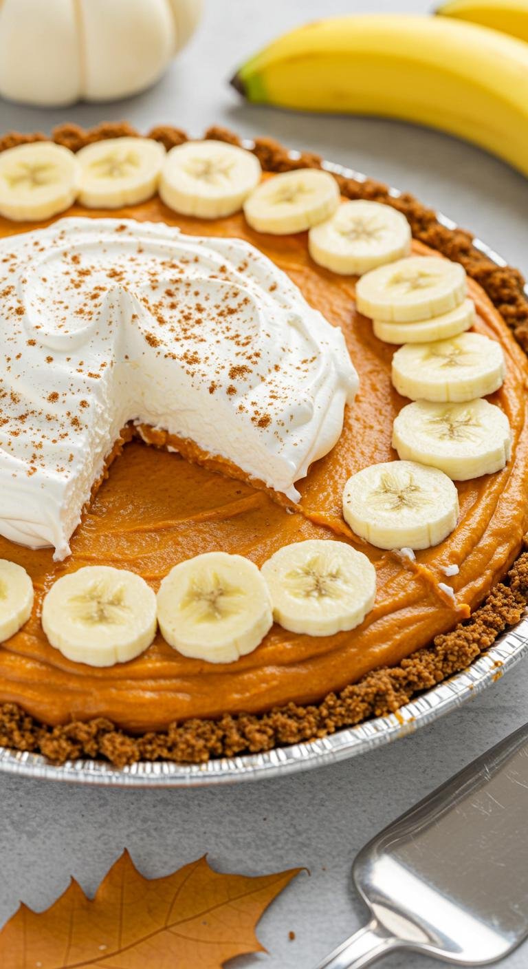 - Slice bananas into the pie crust, pour the pumpkin mixture on top, and chill to set.