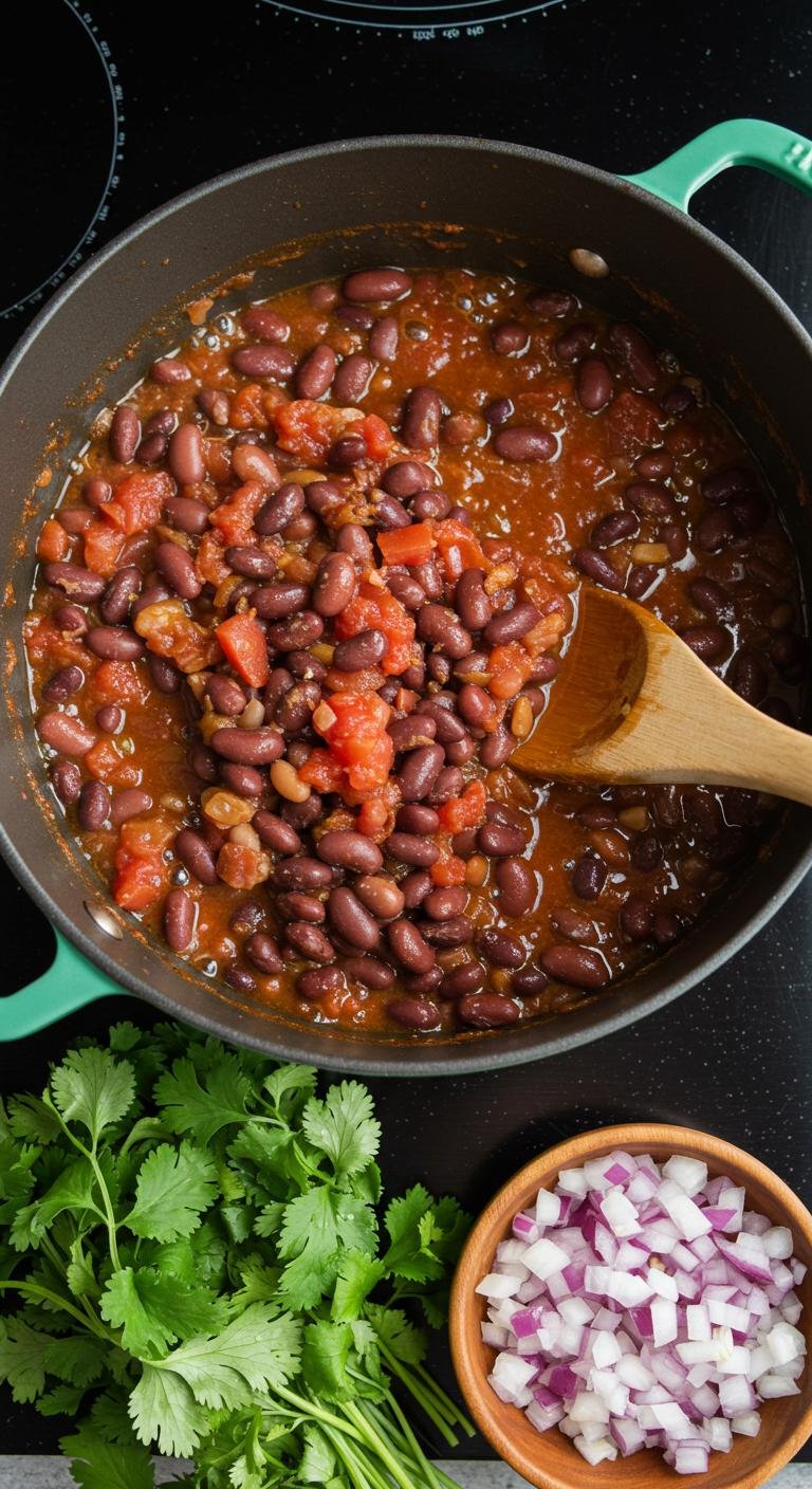 - Add beans, tomatoes, chili powder, and salt. Stir and simmer for 20 minutes.