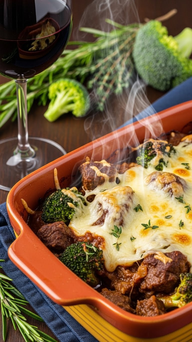- Mix beef with broccoli, soup, rice, and garlic powder in a baking dish.