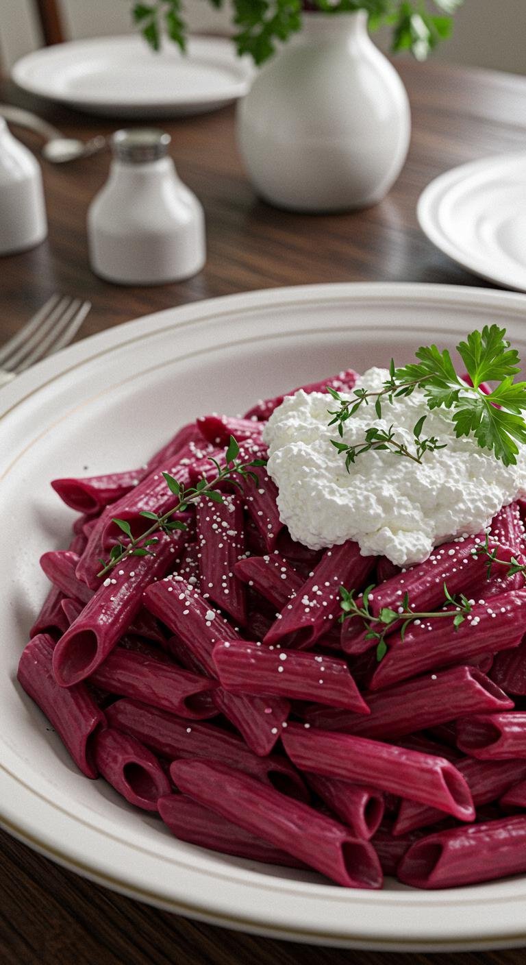 - Combine beet puree, cream, and cheese, season, and mix with the pasta.