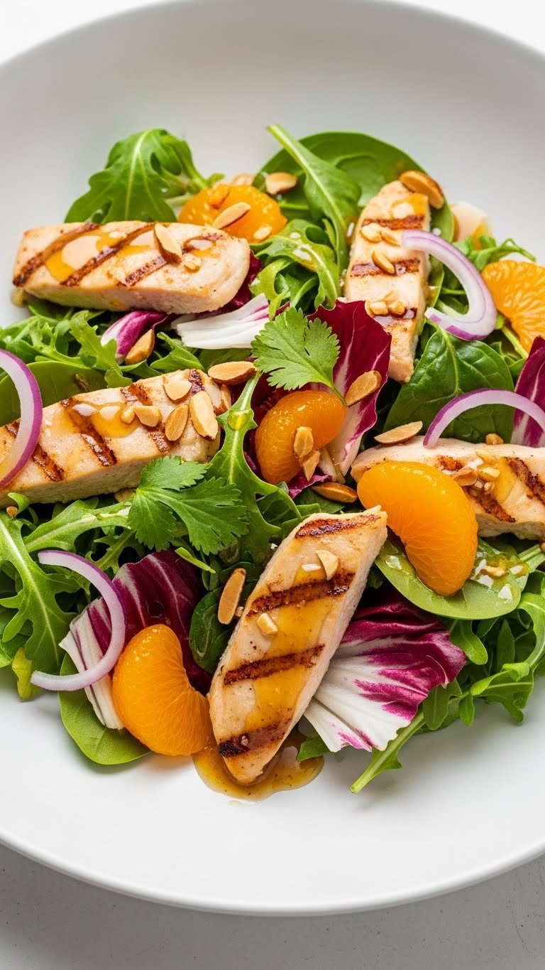- In a bowl, combine chicken, mixed greens, and mandarin oranges.