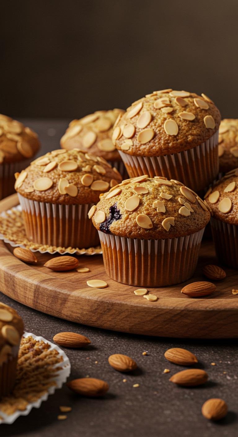 - Top each muffin with sliced almonds before baking for 18-20 minutes.