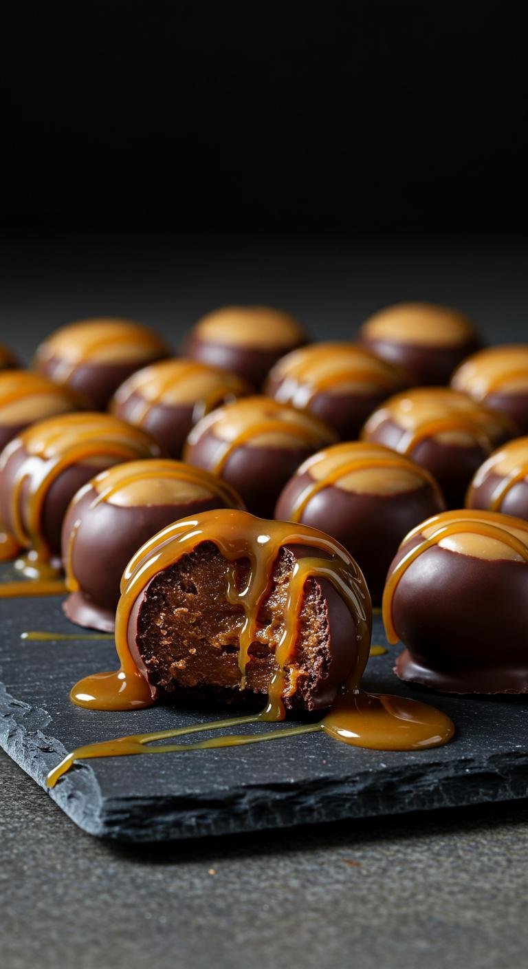- Prepare traditional buckeyes, then drizzle melted caramel over cooled chocolate.