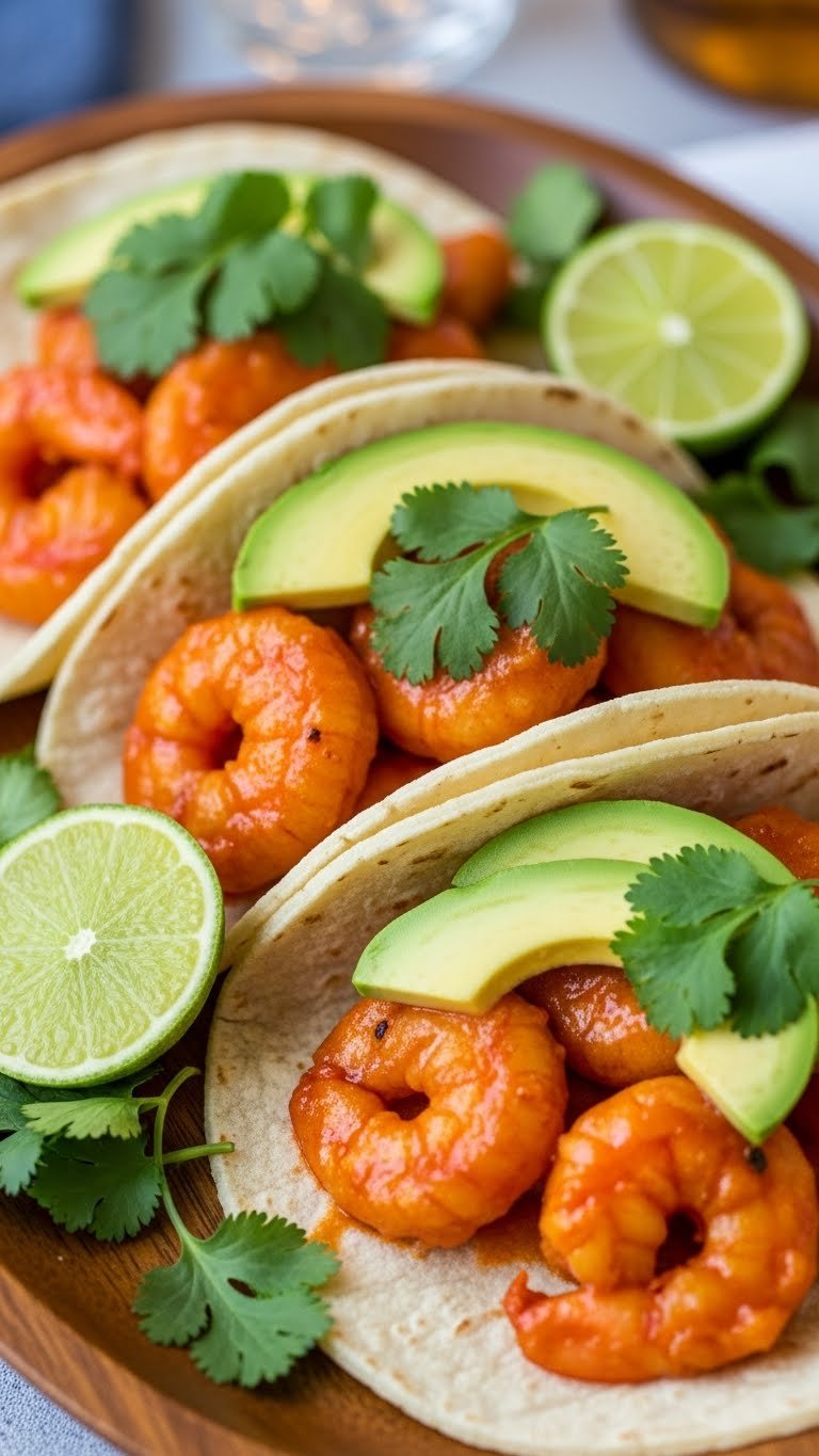- Warm tortillas, fill them with shrimp, and top with avocado and cilantro.