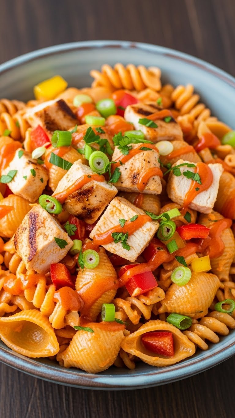 - In a large bowl, mix pasta, chicken, buffalo sauce, and bell peppers together.