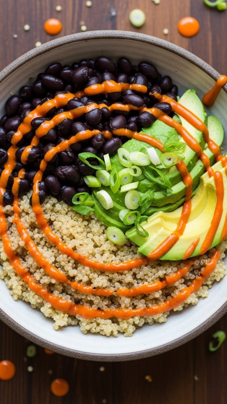 - In a bowl, combine quinoa and black beans, then drizzle with buffalo sauce.