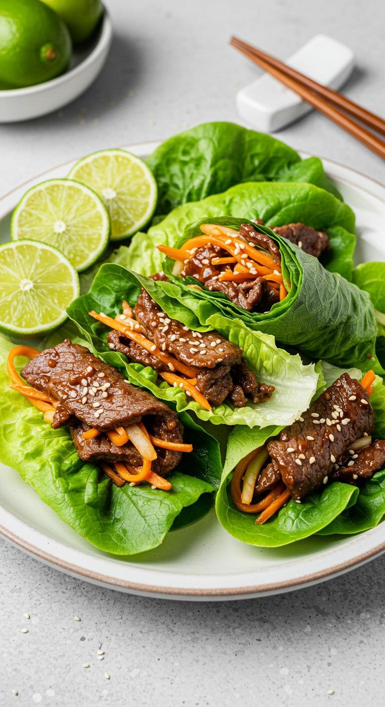 - Lay beef into lettuce leaves and top with cucumber and carrot.