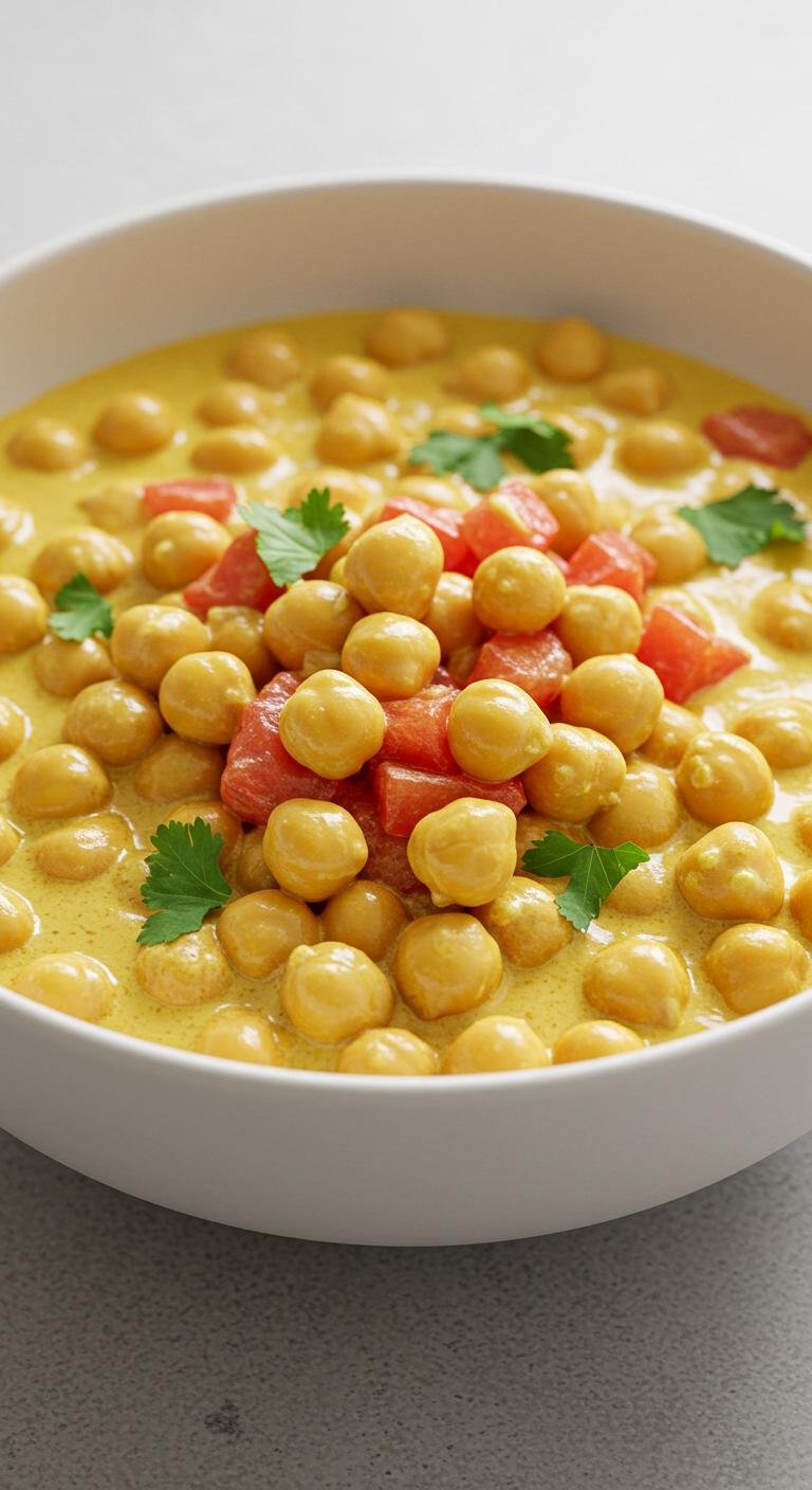 - Sauté onions until translucent. Add chickpeas, coconut milk, tomatoes, and curry powder.