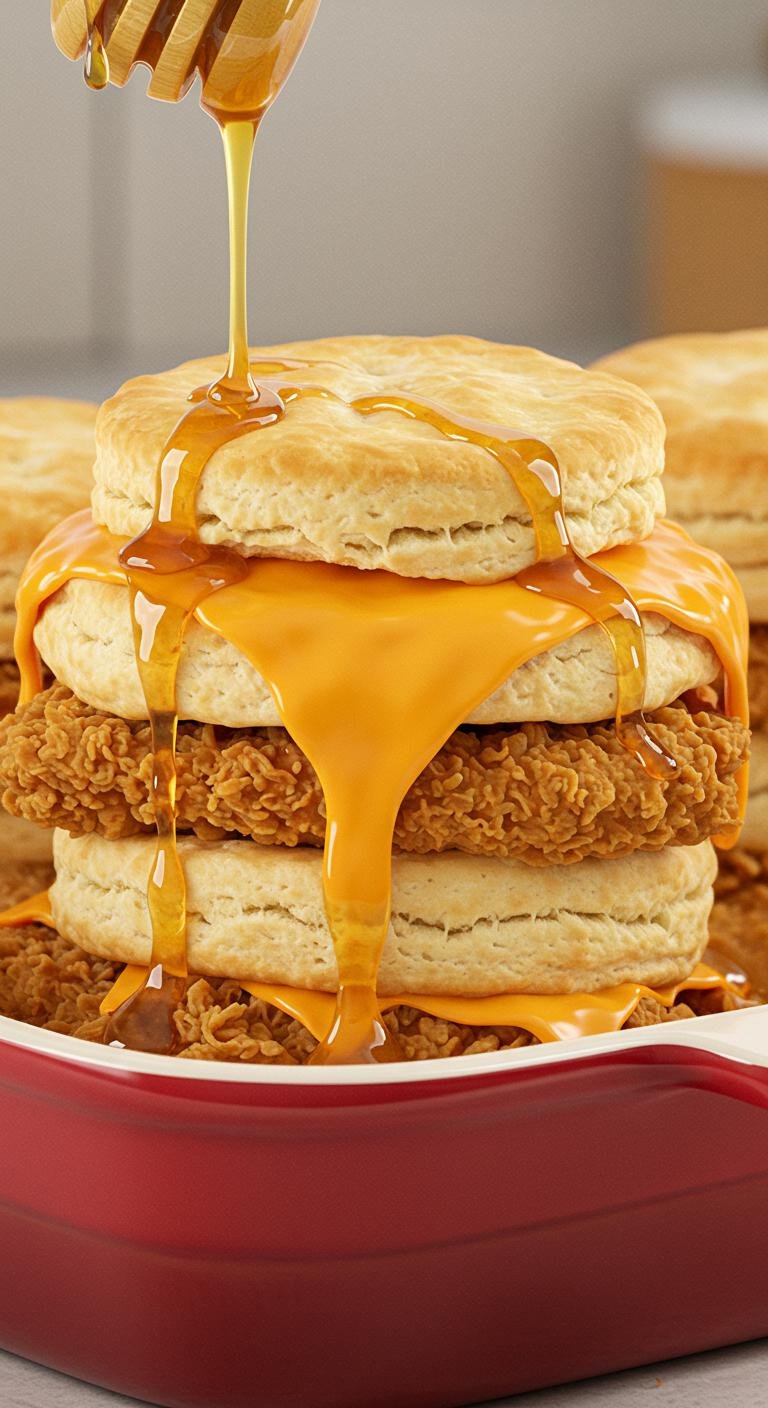 - Layer biscuits, chicken, and cheese in a baking dish.