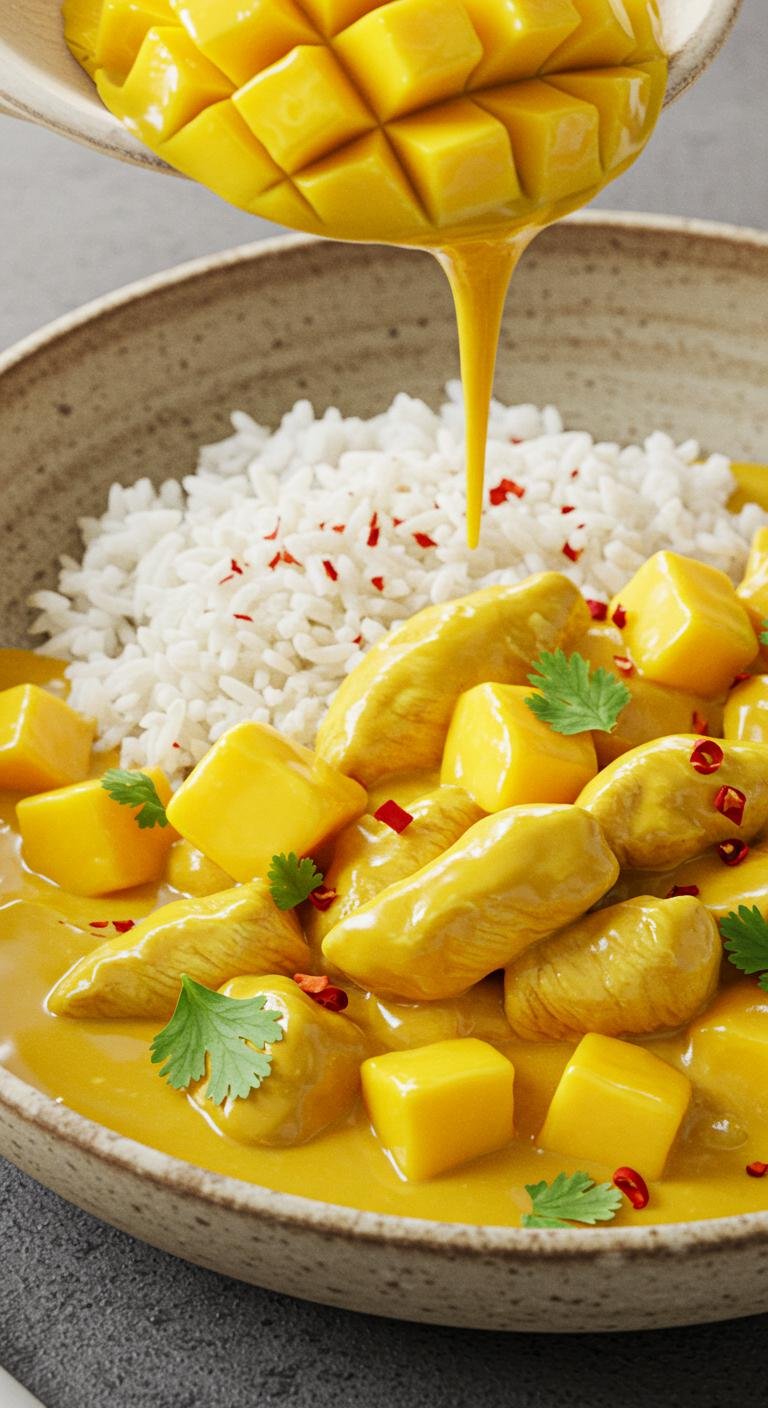 - Stir in coconut milk and diced mango, simmer for 8 minutes.