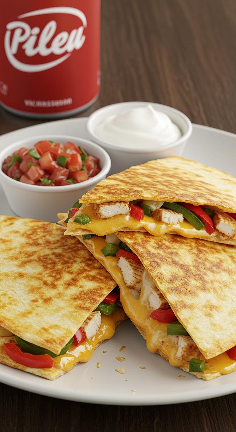- Heat oil in a skillet; layer ingredients on half of each tortilla.