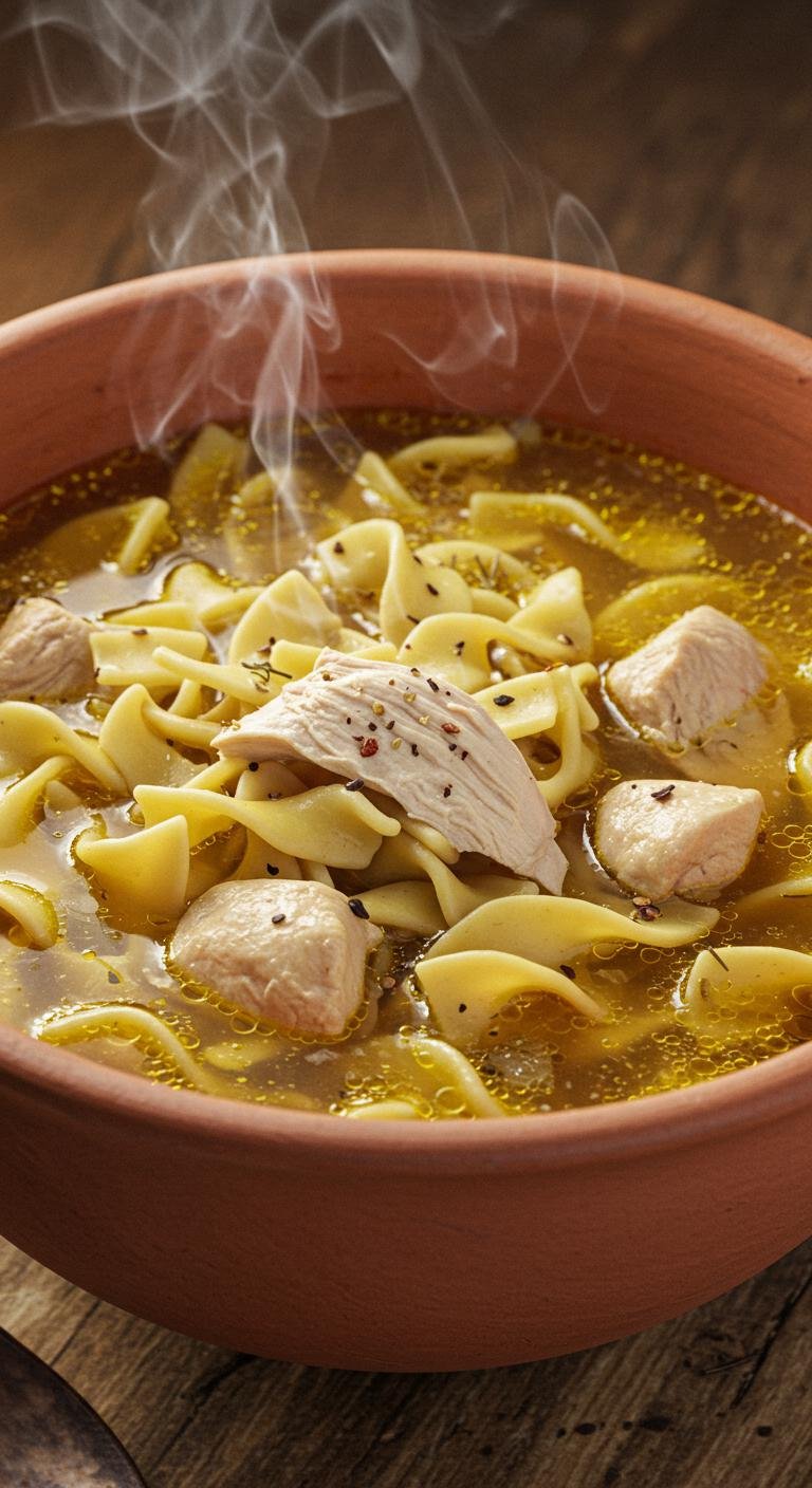 - Remove the chicken, shred it, and return it to the pot. Add the egg noodles and cook until tender.