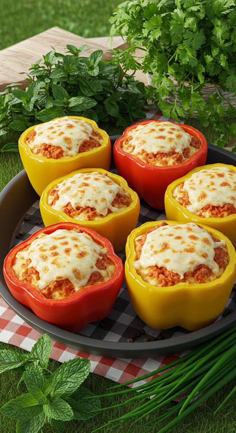 - Mix chicken with marinara, stuff into peppers, and top with cheeses.
