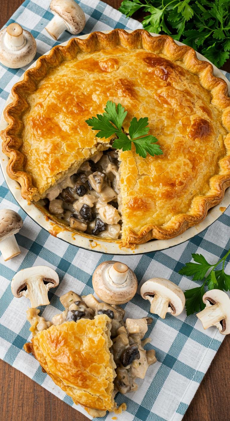 An indulgent pie that showcases the wholesome flavors of chicken and earthy mushrooms.