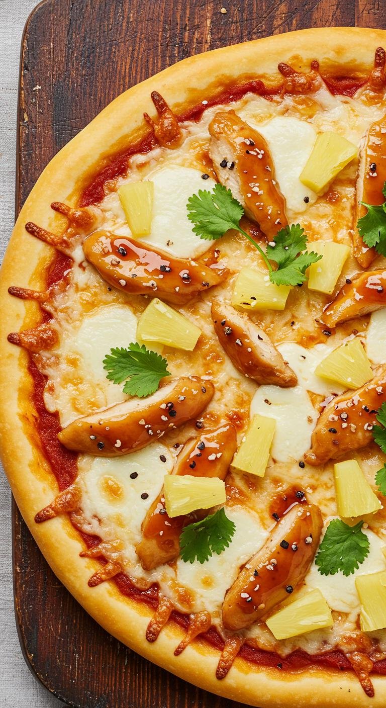 - Mix chicken with teriyaki sauce and spread over pizza crust.