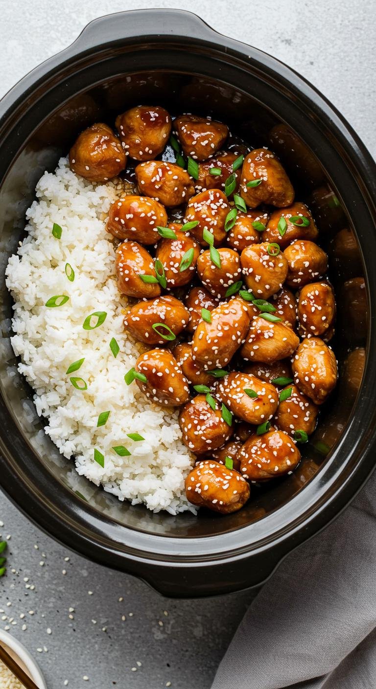 - Place chicken and onions in a slow cooker, pour teriyaki sauce over.