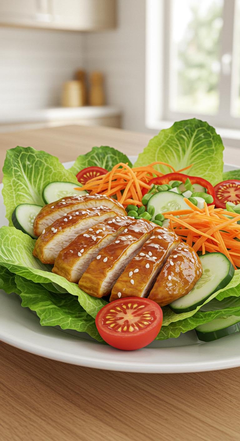 - Top with sliced chicken and drizzle with teriyaki dressing.