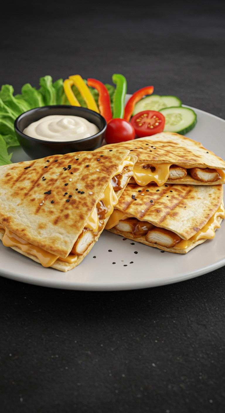 - Place a tortilla on a skillet, layer with cheese and chicken mix, then top with another tortilla.