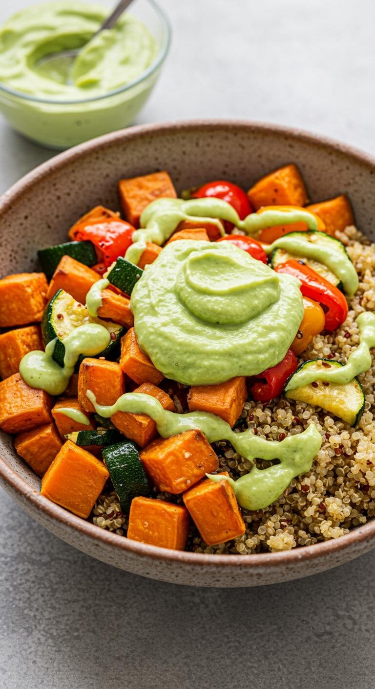 - Start with quinoa as your base, then layer the roasted vegetables on top.