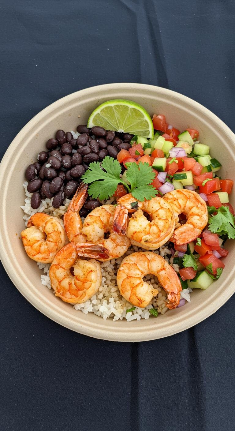 - Place rice in the bowl, followed by grilled shrimp and black beans.