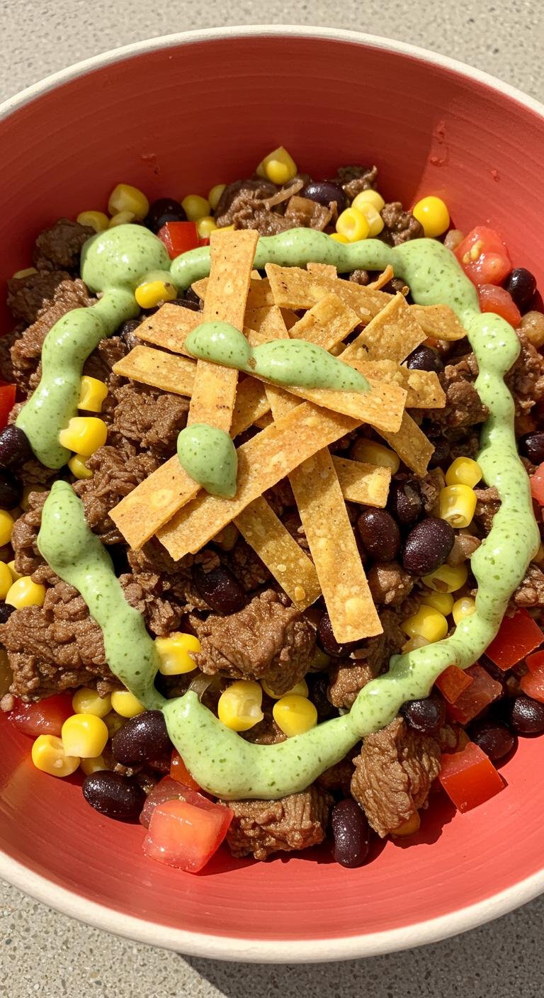 - Drizzle with creamy chipotle sauce and garnish with bell peppers and cilantro.