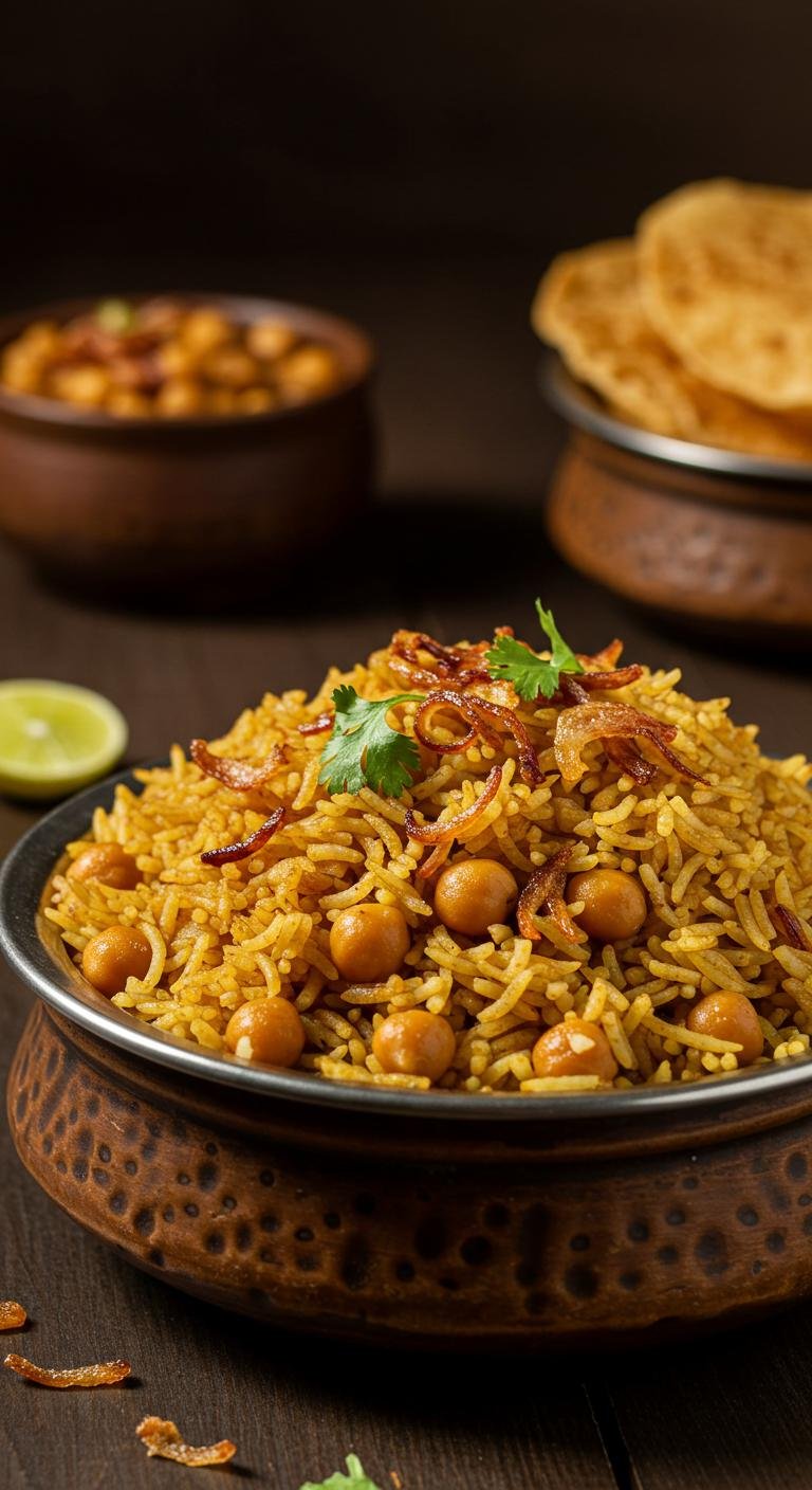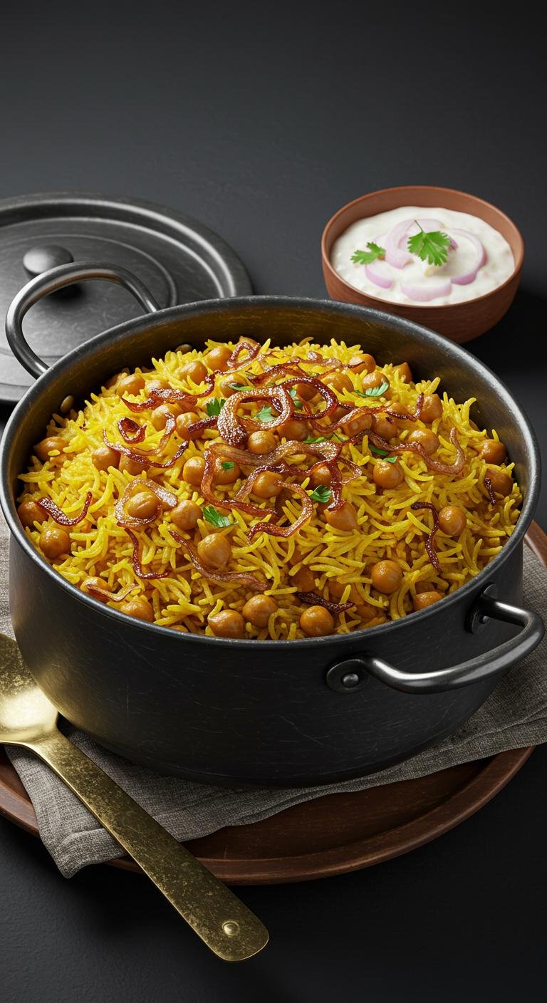 - Sauté onions until golden; add tomatoes, chickpeas, and biryani masala.