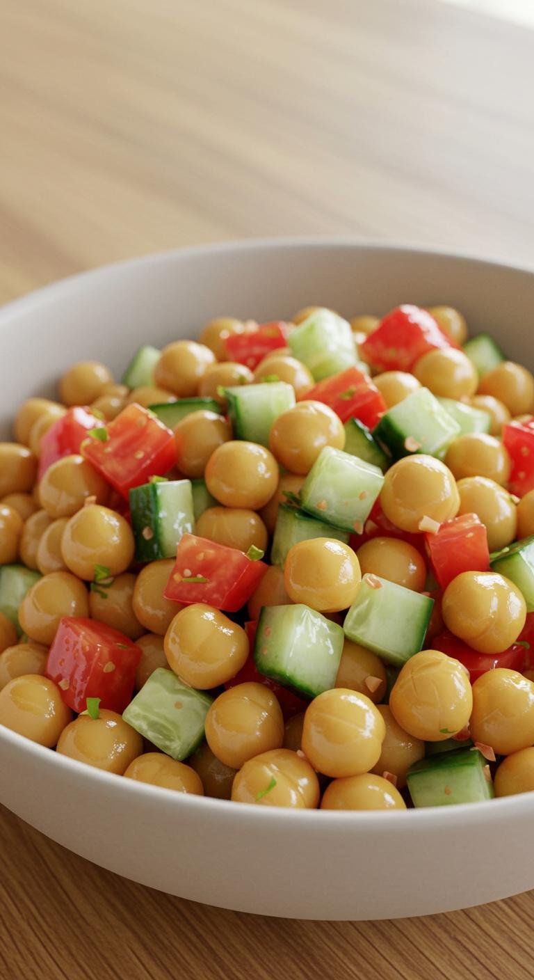 - In a bowl, combine chickpeas, cucumber, tomato, and onion.