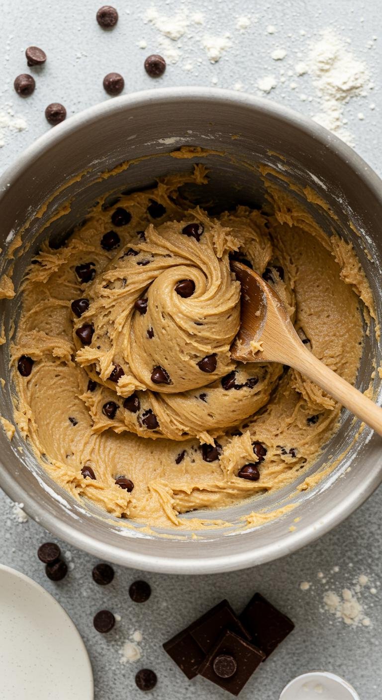 - Mix in flour and vanilla, then fold in chocolate chips.