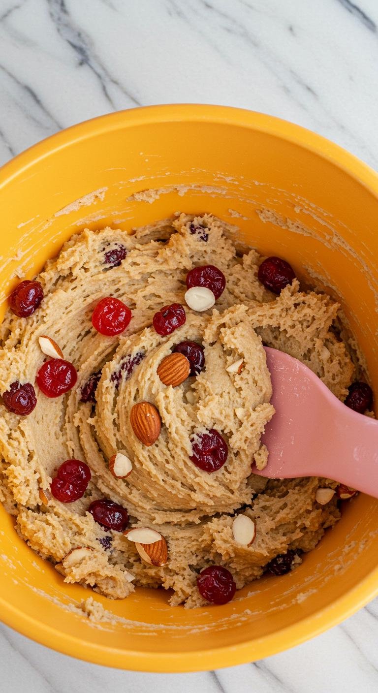 - Mix in flour, then fold in chocolate, coconut, and almonds.