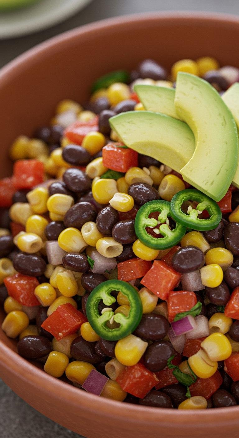 - Mix beans, corn, tomatoes, and jalapeños in a large bowl.