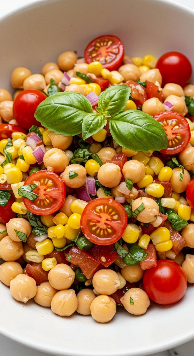- Combine chickpeas, tomatoes, basil, and onion in a bowl.