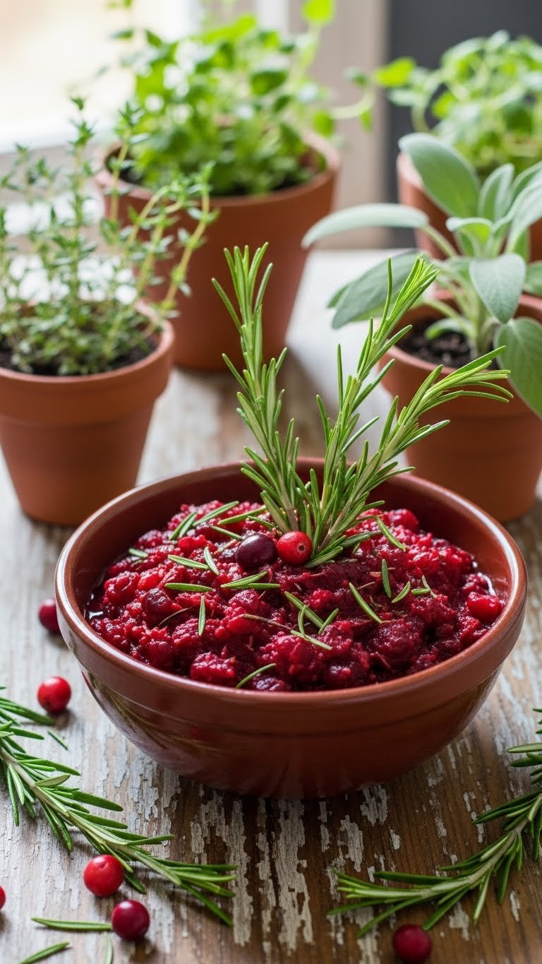 - In a saucepan, heat cranberries, sugar, and water with rosemary.