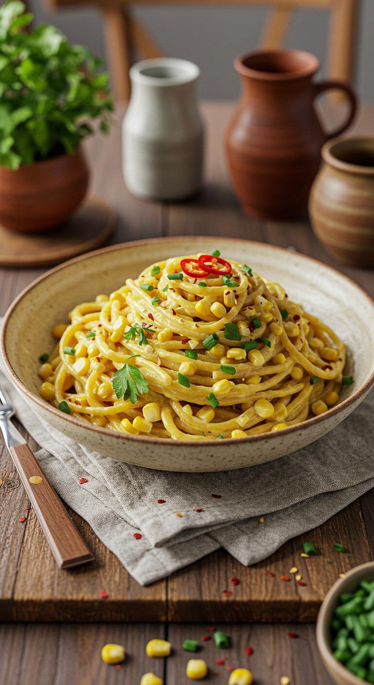 - In a skillet, combine cooked pasta, cream corn, and red pepper flakes, and stir until heated.