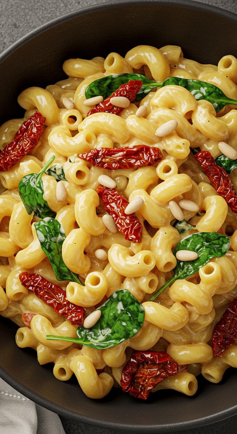 - Mix pasta, sun-dried tomatoes, spinach, feta, and broth in the crockpot.