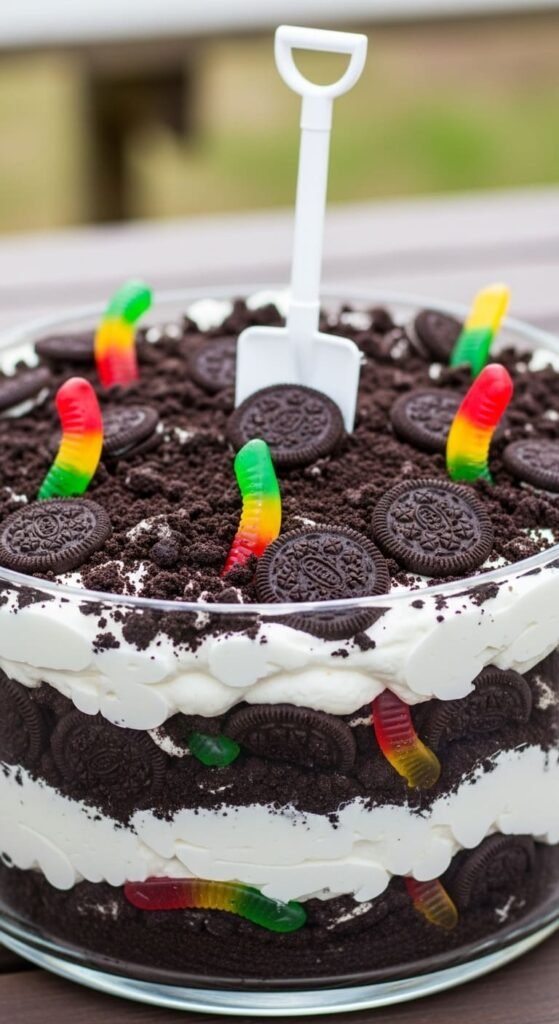 - Layer the cake and pudding mixture, topping with more crushed Oreos and gummy worms for garnish.