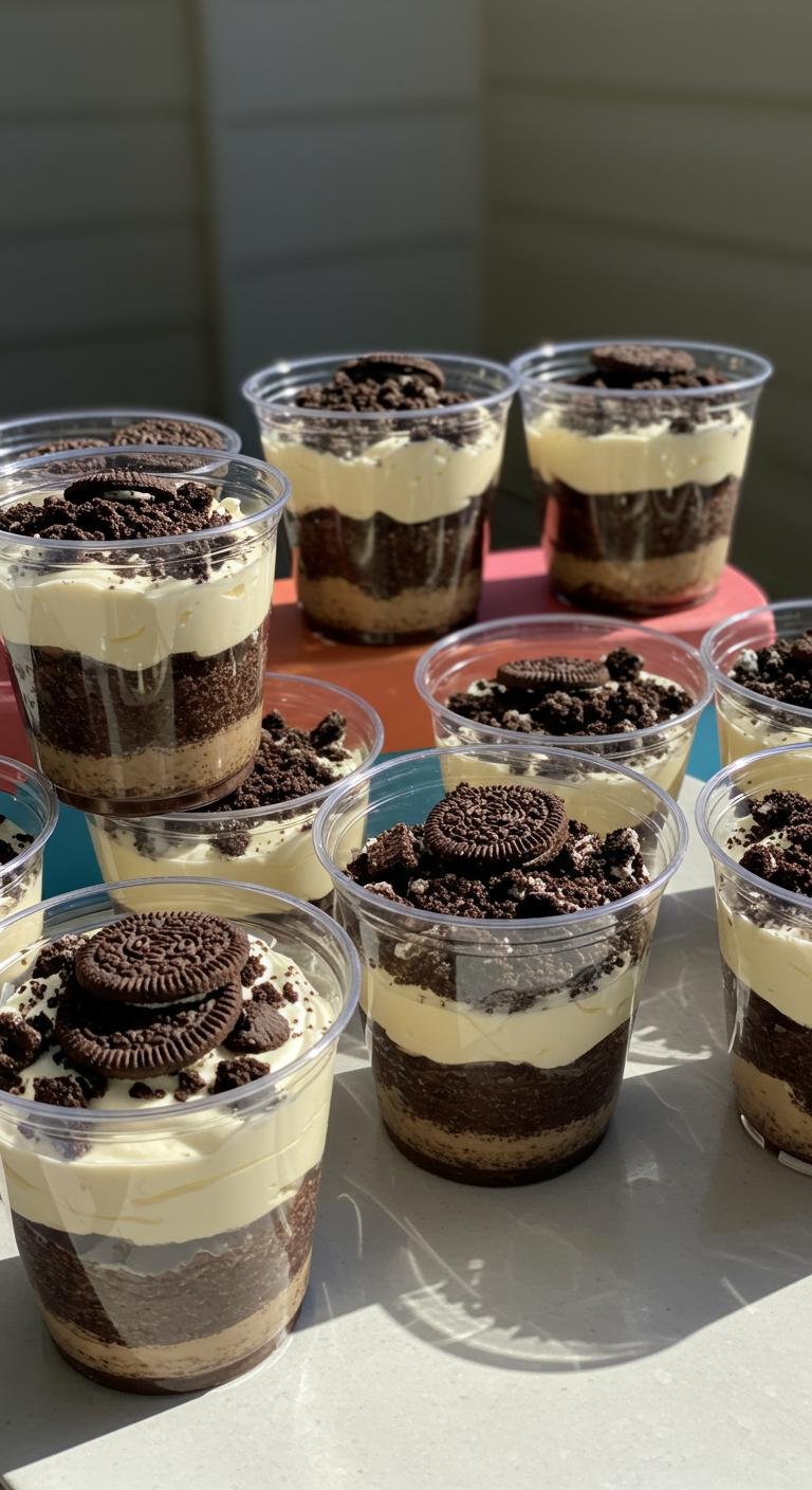 - In cups, layer crumbled cake, pudding, and crushed Oreos, topping with whipped cream.