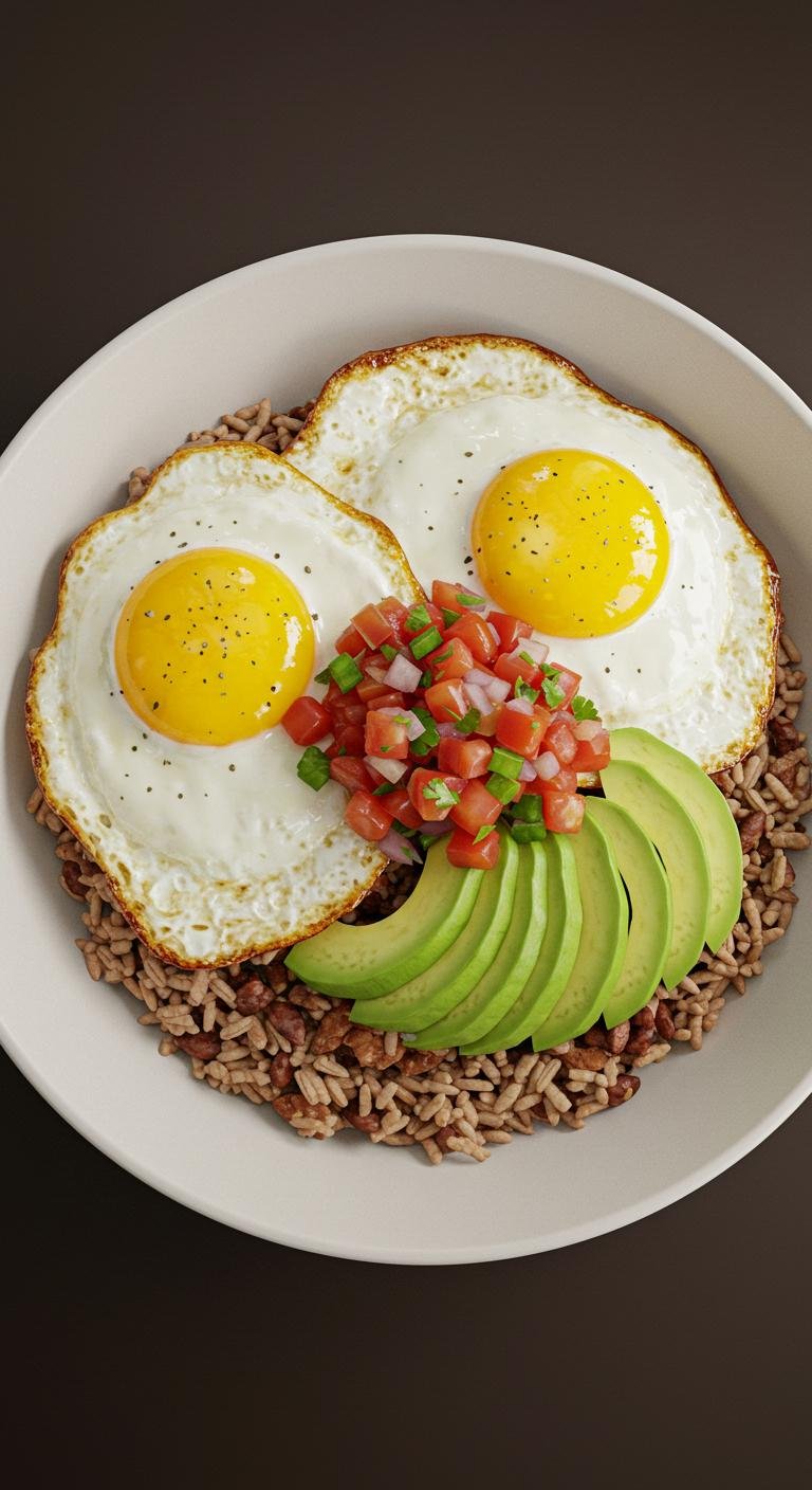 - Layer the rice in a bowl, top with fried eggs, avocado slices, and salsa.