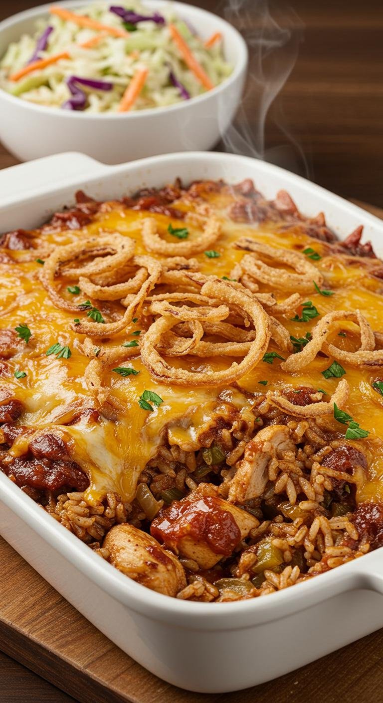- Mix cooked rice with chicken and BBQ sauce, then top with cheese.