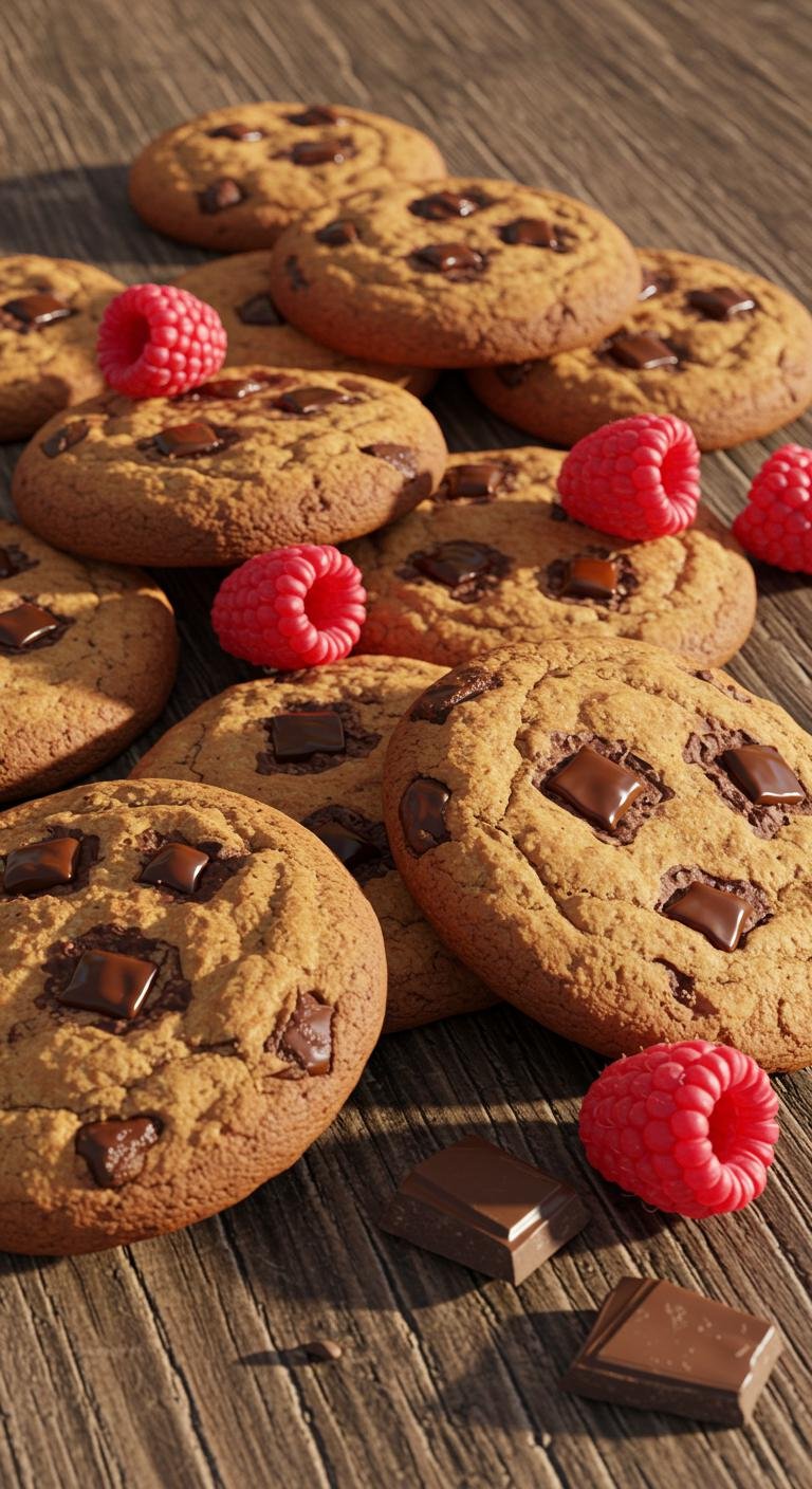 - Beat in eggs and vanilla, then blend in dry ingredients. Gently fold in chocolate chips and raspberries.